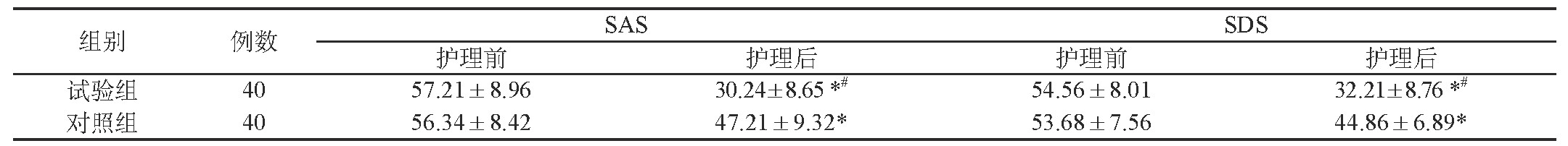 试验组与对照组护理前SAS、SDS差异无统计学意义(P>0.05);两组患者护理后SAS、SDS均优于护理前,差异有统计学意义(P<0.05);试验组治疗后SAS、SDS值均优于对照组,差异有统计学意义(P<0.05);见表1。